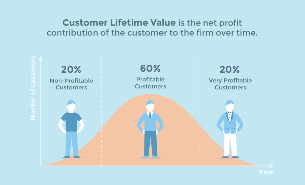 Customer Retention brings an increased number of repeat purchases and a higher Customer Lifetime Value (CLV). You can calculate CLV by dividing the revenue a customer generates divided by the time of their usage of your business.